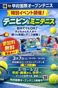 株塾甲府国際オープンテニスを記念して、甲府駅北口「ペデストリアンデッキ」にてテニピン&ミニテニスイベントを開催します。お気軽にお立ちよりください。(景品あり)